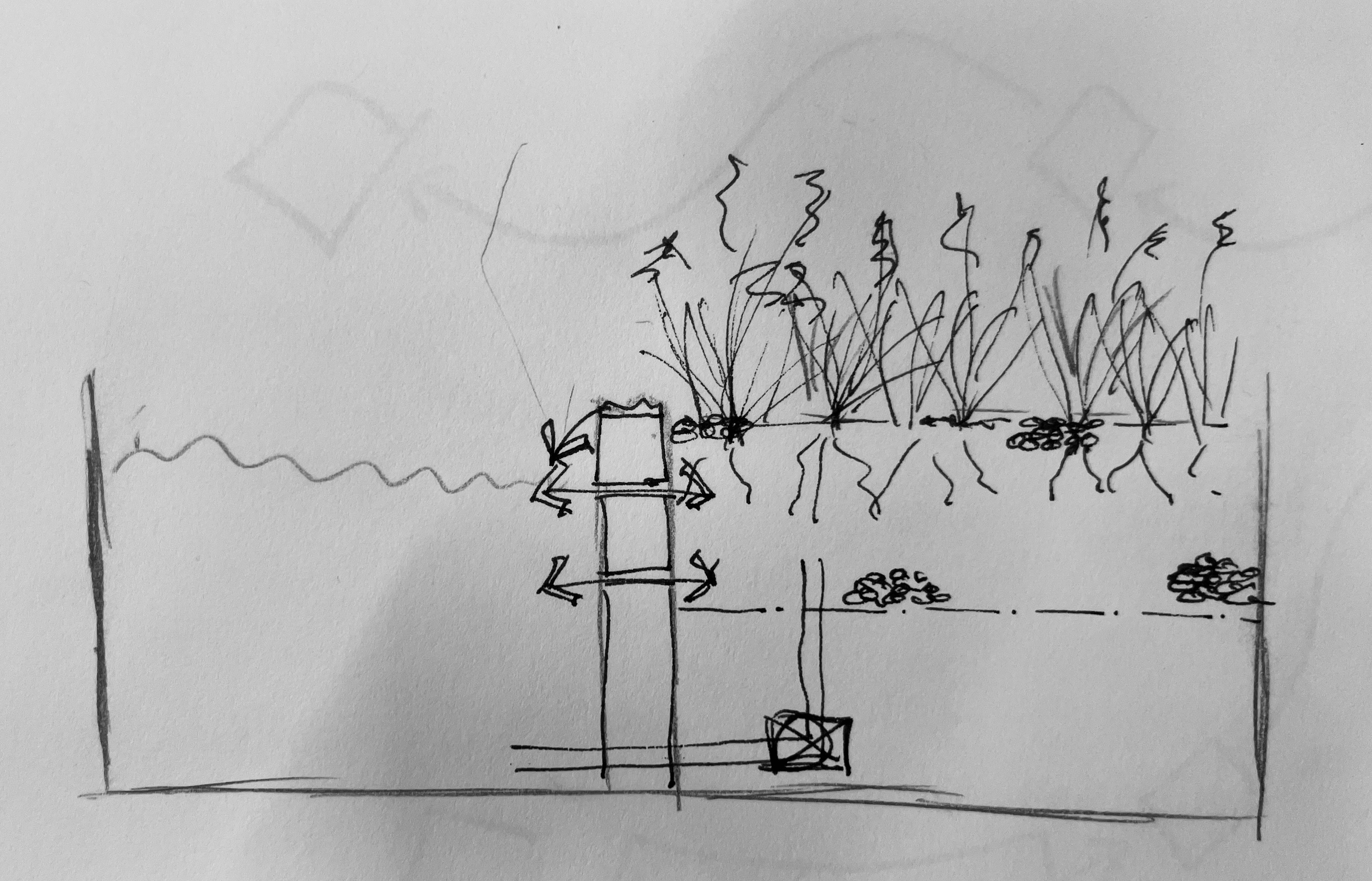 We then developed the logic of a water treatment entry zone, positioned immediately downstream of the inlet. Incoming water would first pass through a sequence of gravel reed banks, functioning as a natural filtration system. These beds would slow flow velocity, allowing suspended sediments to settle while plant roots and microbial biofilms remove nutrients and pollutants through biological uptake and adsorption.