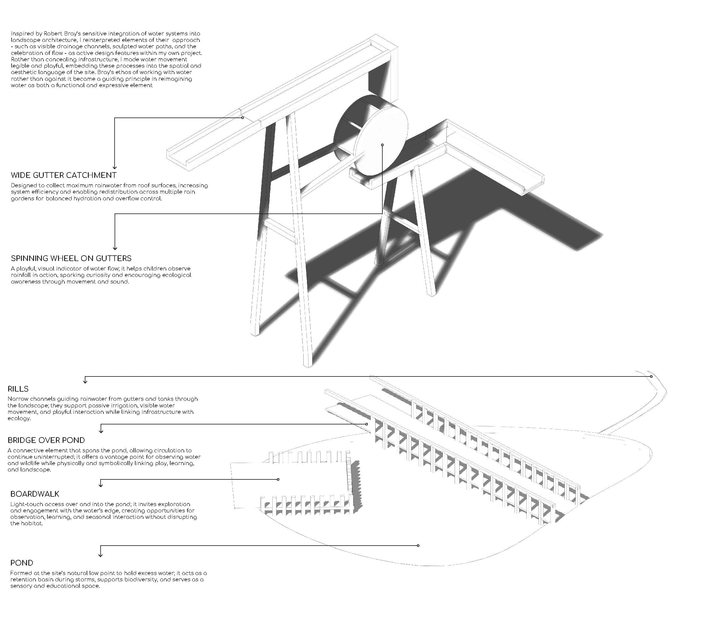 Inspired by the work of Robert Bray, whose practice centres on making hydrological systems visible and educational, Tesserae transforms water into the site’s central design driver. Rather than diverting it underground, the project allows it to move, gather, and shape the terrain.