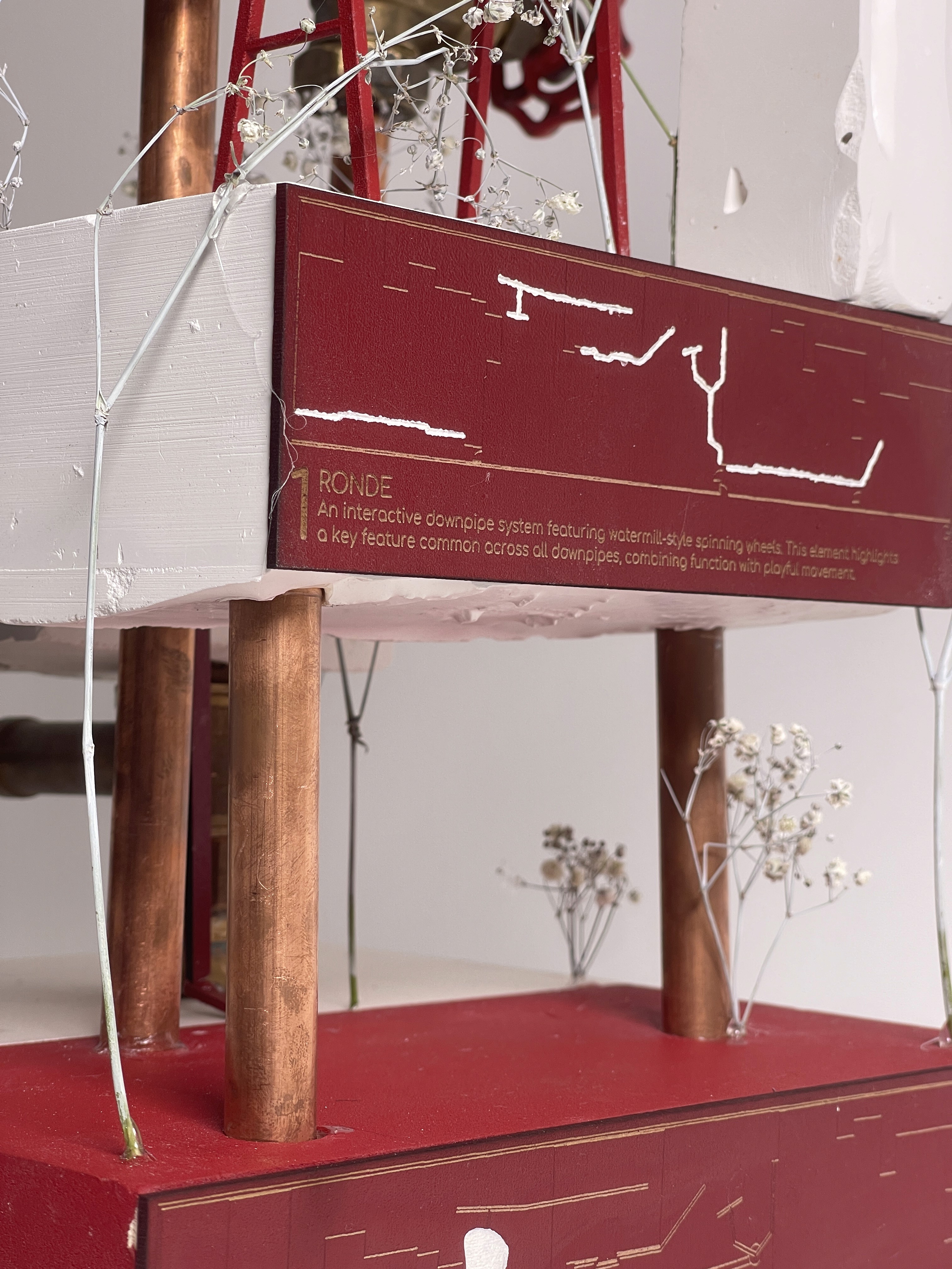 Inspired by Robert Bray’s philosophy of water-led design, a bespoke 3D-printed guttering system is embedded into the model, transforming conceptual drawings into physical infrastructure. The sculptural components are scaled, placed, and articulated to show how design can capture the rhythm of rain and response. These features, both functional and symbolic, carry the imprint of speculative ecology and purposeful play.
