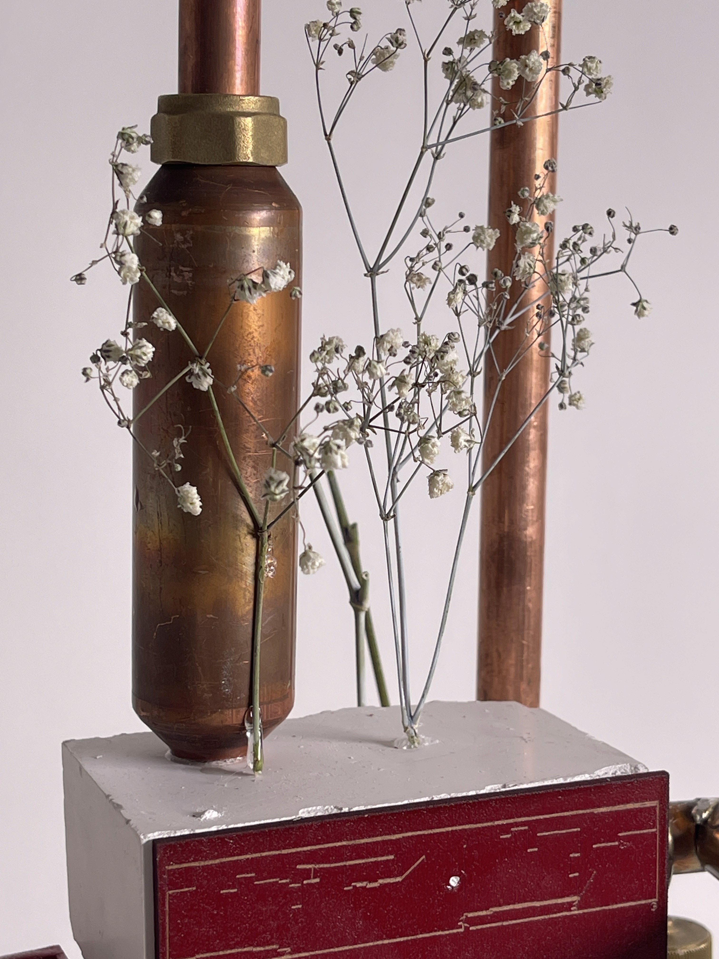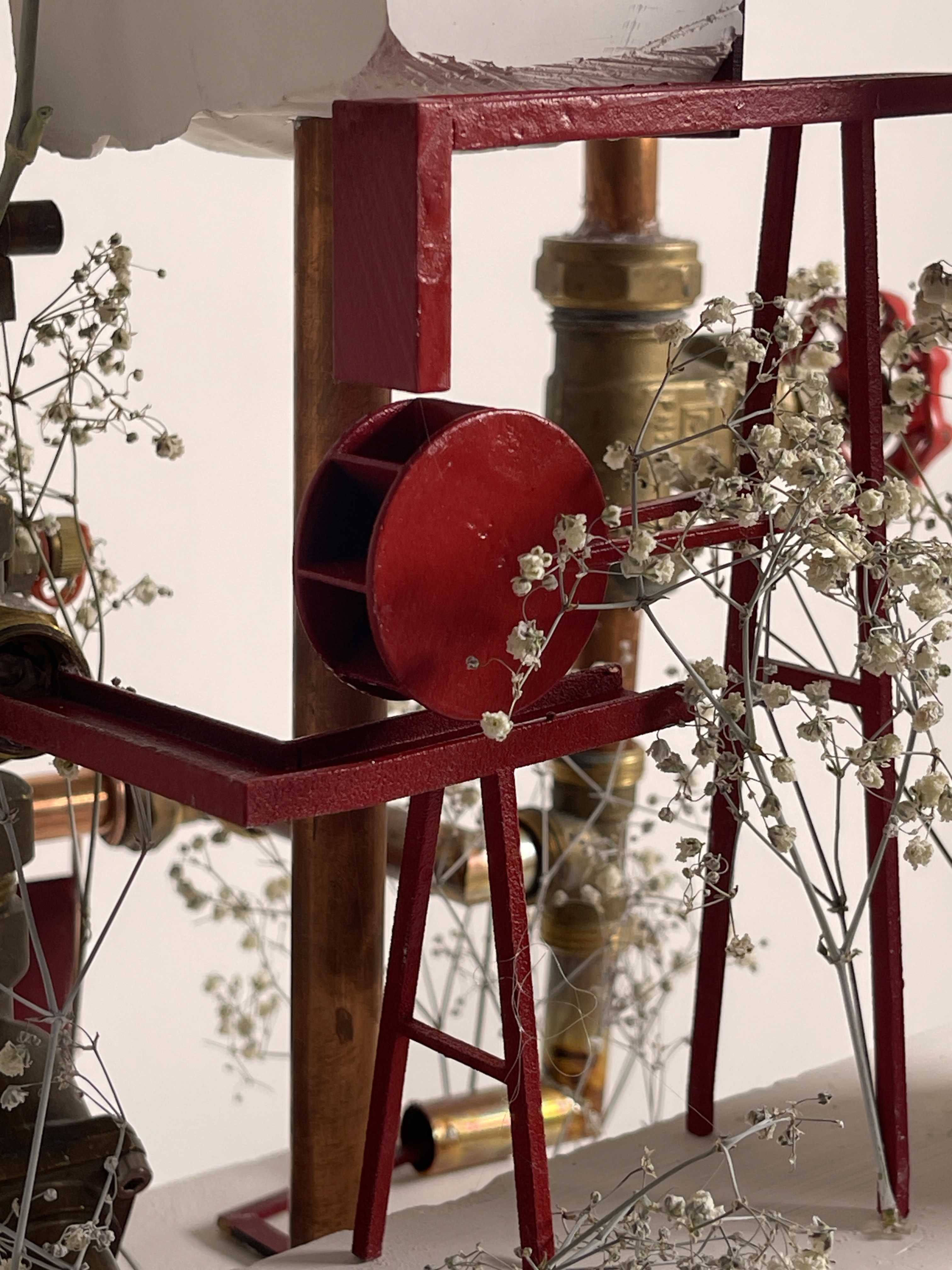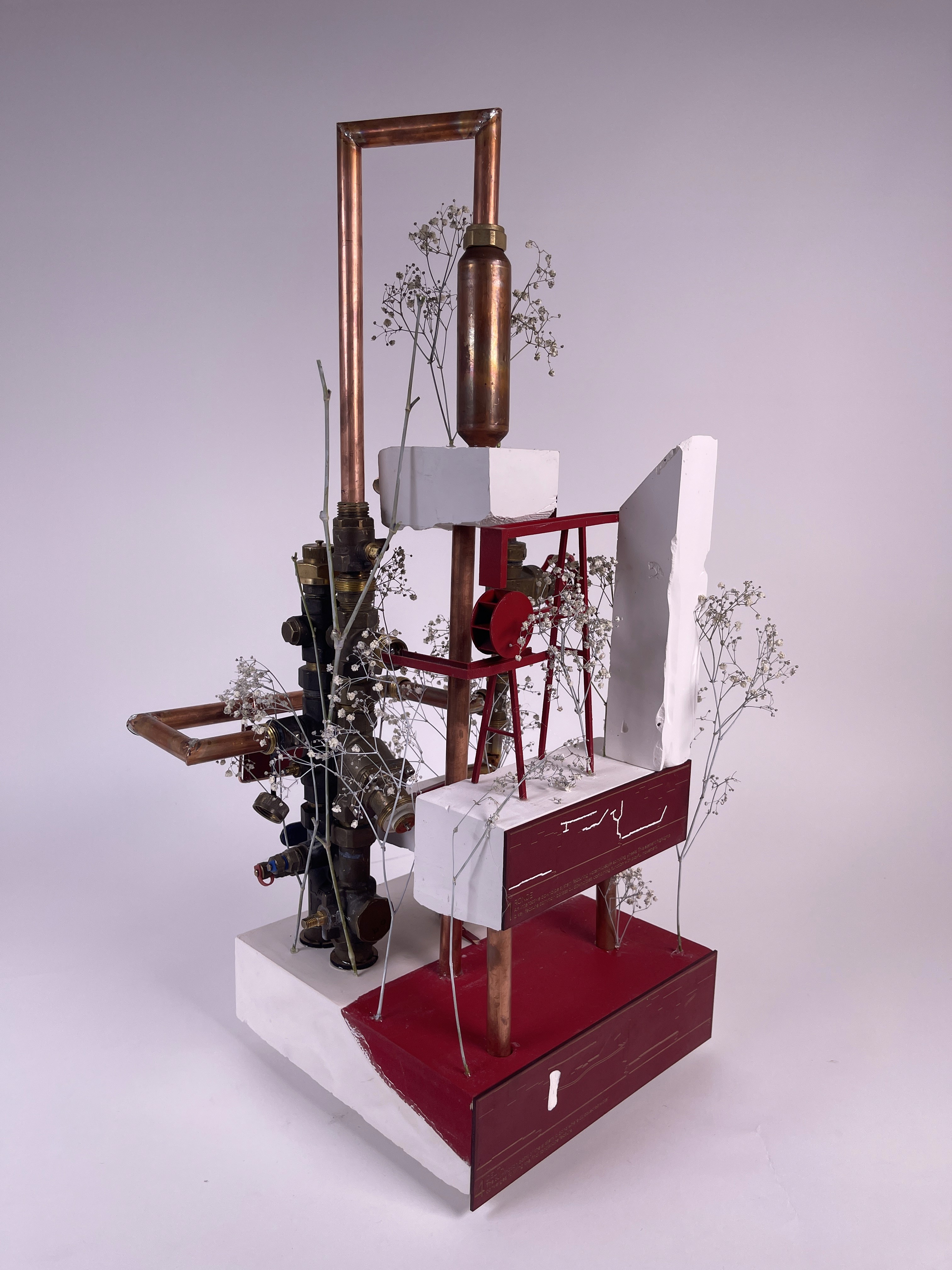A network of customised plumbing components threads through the model, tied together with welded copper piping that gleams across the surface like a drawn line. These elements - once ordinary, now reimagined - visualise the movement and control of water across the site. They trace the system’s logic with elegance, making water's journey visible, legible and continuous.